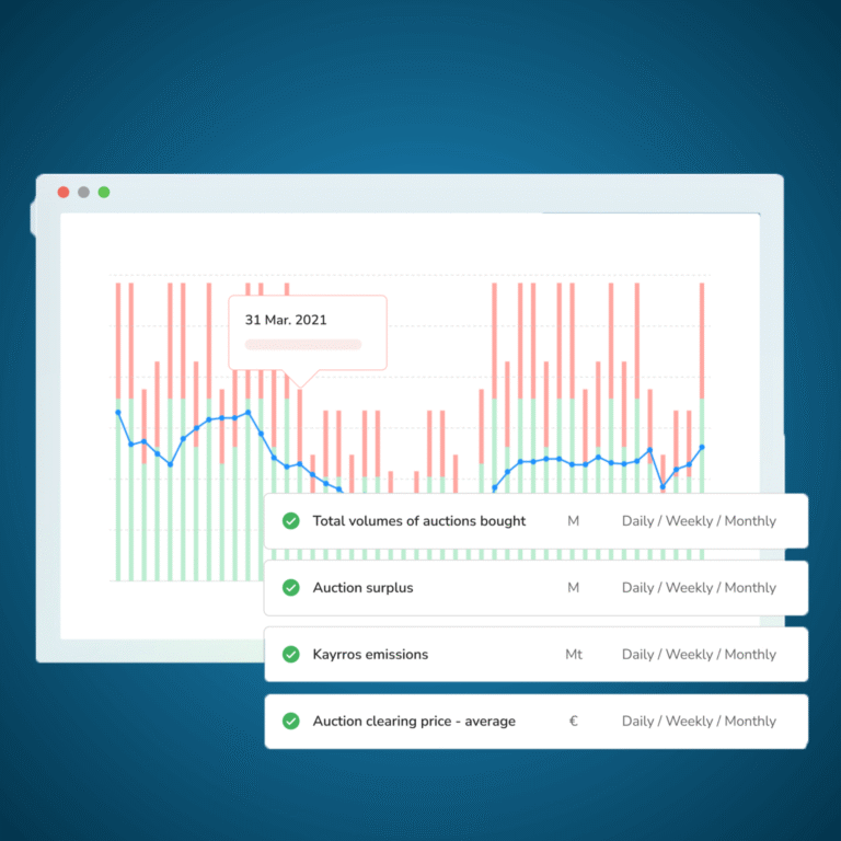 Beyond its unique measurement of emissions demand, Kayrros provides a global view of the ETS market including supply, demand forecast, auction volumes and prices, etc.