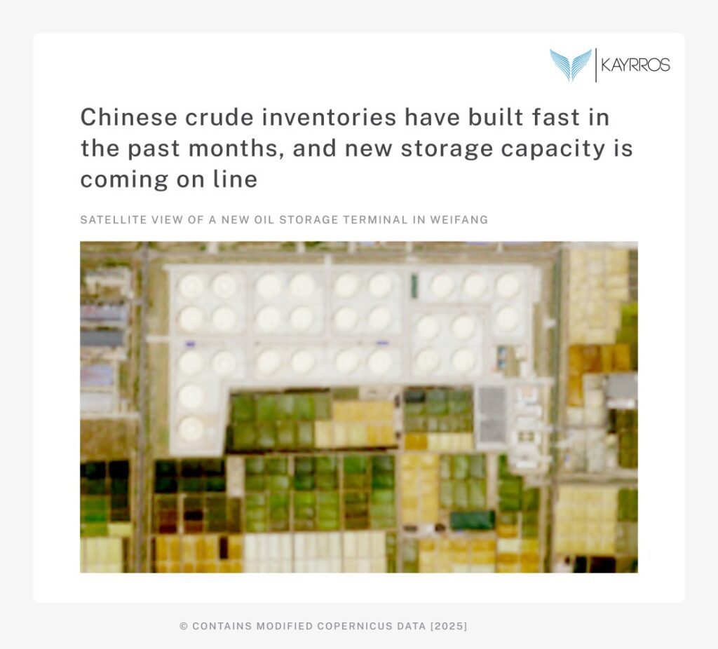 • Likewise, the latest Chinese builds weren’t limited to teapots. State-owned enterprises (SOEs) also posted dramatic gains. CNOOC’s brand new Dongying terminal, which appears earmarked for strategic stocks, dominated recent builds in Shandong.